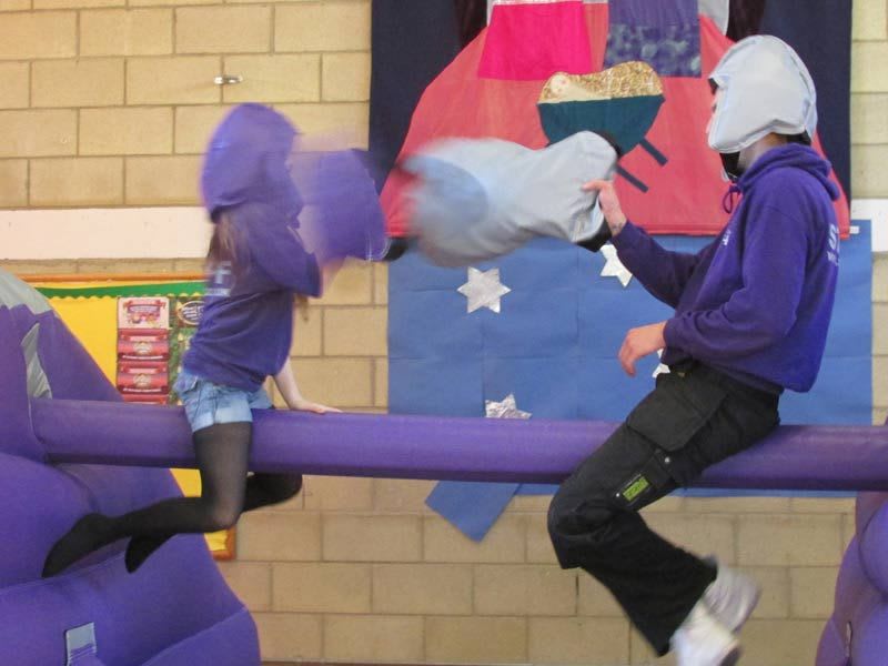 All kids love a pillow fight, but how good is their balance whilst doing so?! Sit on the pole and see who has the best skill whilst trying to swipe their opponent off with our special padded pillows. This item is also commonly referred to as a Pillow Bash. This items very nicely compliments any bouncy castle hire, but also our ever popular Gladiator Joust.