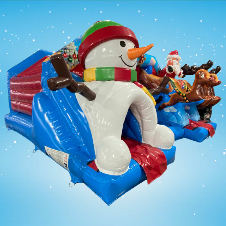 One slide features a giant 3D Snowman, while the other has a 3D Santa Sleigh and reindeer, making it a real highlight for parties in Great Barford, Bromham, or Stewartby. Guests bounce, slide, and pass right through these festive characters, adding an extra layer of fun and excitement to any xmas gathering.