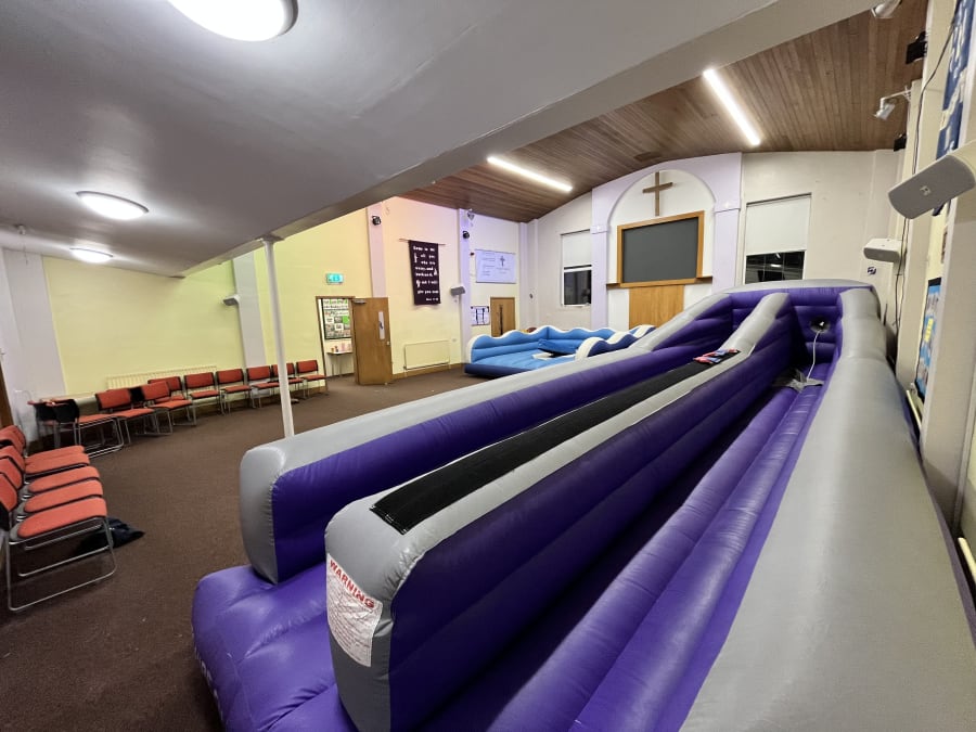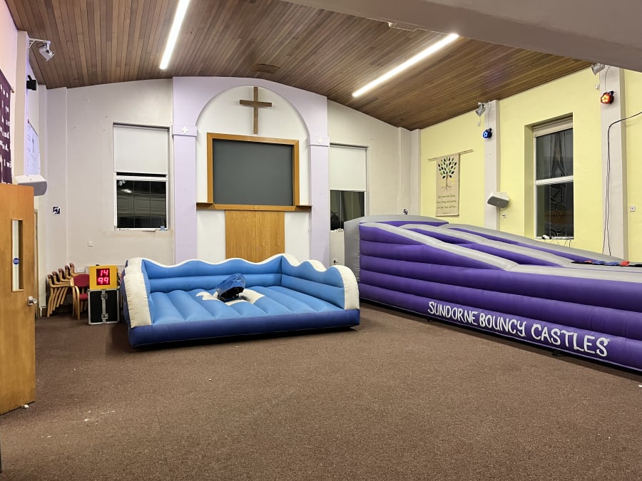 The size of this hall allows for us to install both standard bouncy castles, bouncy castle combos and some inflatable game hire including our bungee run, surfing simulator and even an assault course!