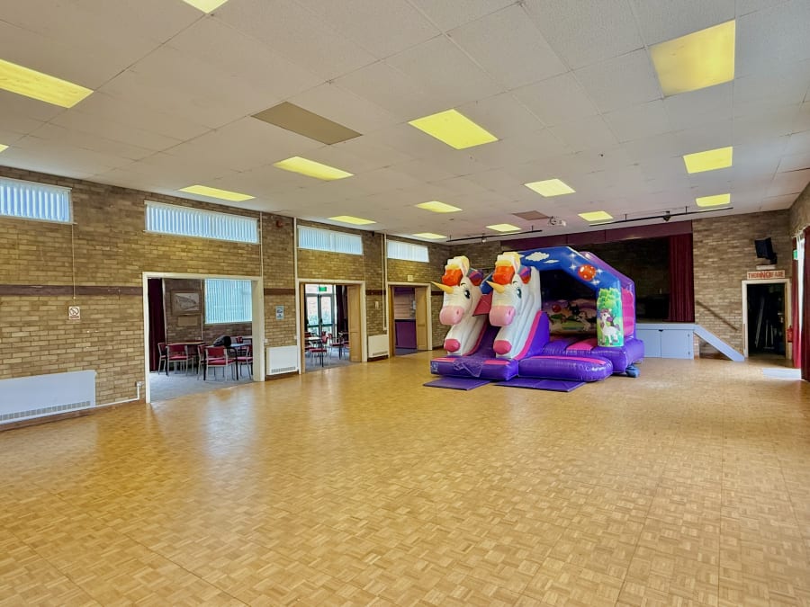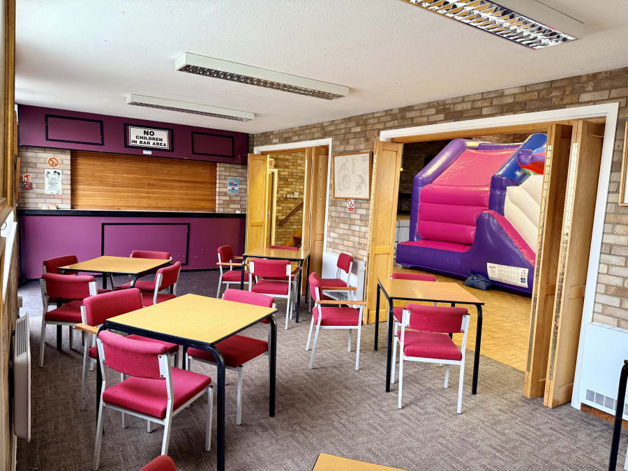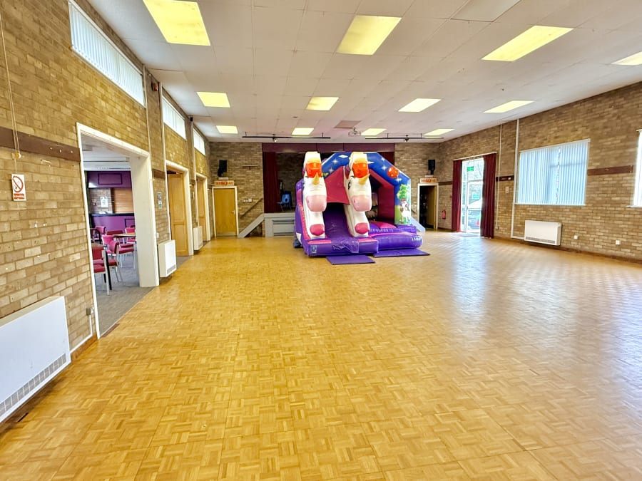 The hall offers a spacious interior with a reasonably high ceiling, making it well suited to indoor bouncy castle hire. It provides plenty of room for children to enjoy jumping, bouncing and playing safely, while still leaving space for seating, party tables and food areas.