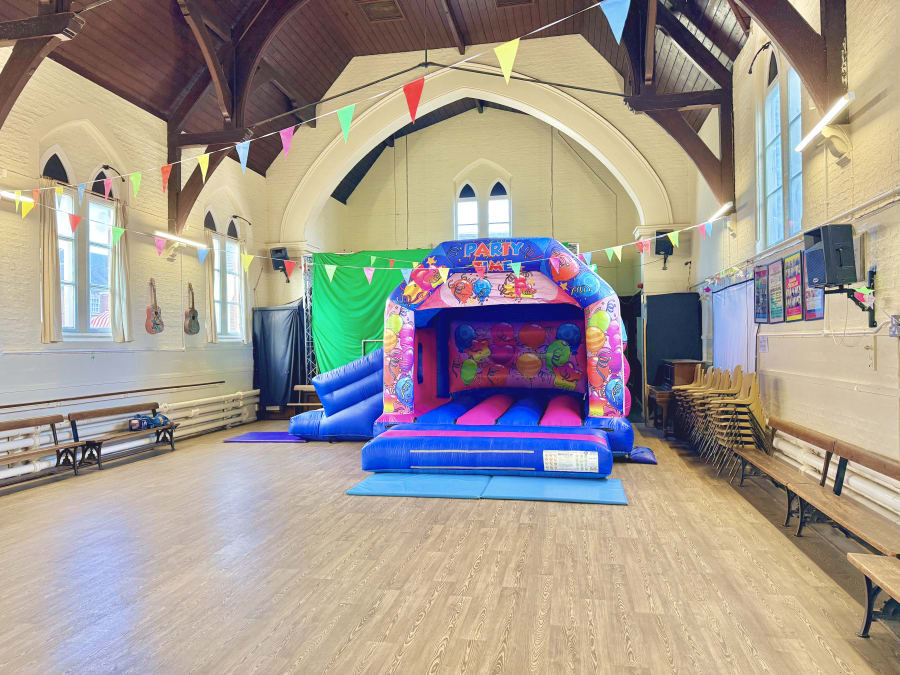 The hall itself is long and narrow in layout and provides an excellent party space. The width is more than sufficient to accommodate our side-slide combi bouncy castles, and the generous length of the room means the inflatable can be positioned at one end while still leaving plenty of usable space in front. This makes it ideal for a child’s bouncy castle party, with room left over for add-ons such as didicars, soft play, ball pools or some of our giant games.