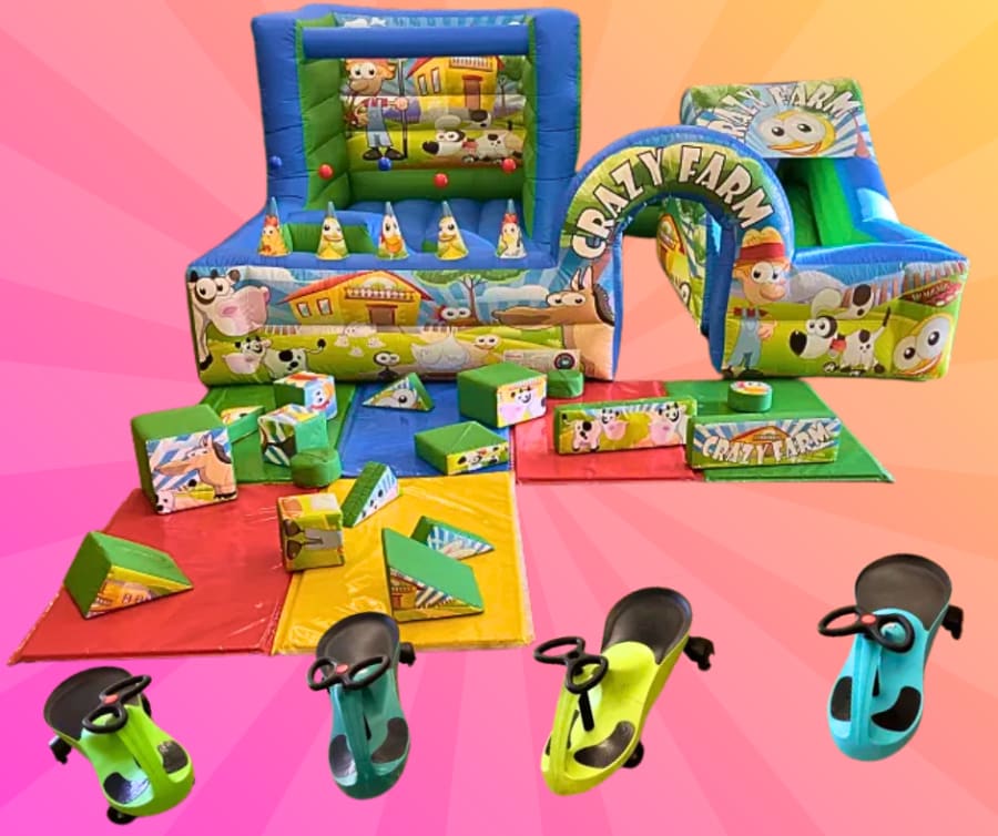 The package combines our Crazy Farm themed 17 Piece Soft Play Kit, 15x15ft Crazy Farm themed Soft Play Park and our immensely popular Didicars.